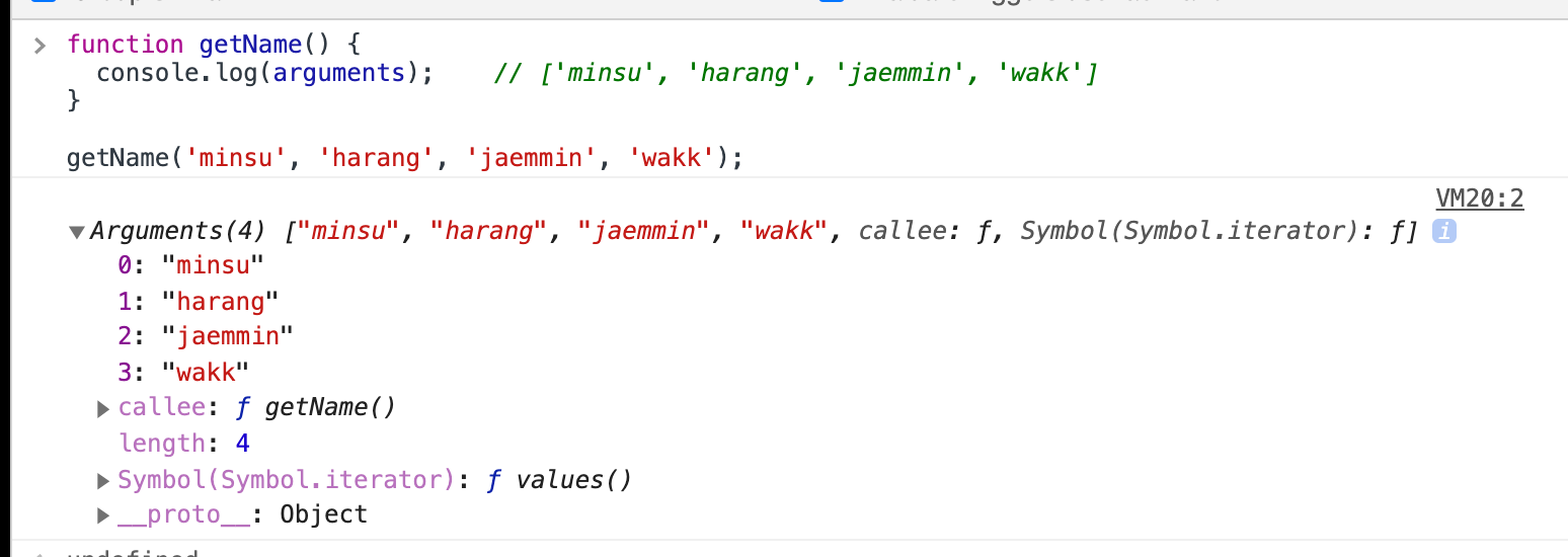 rest parameters 대신 arguments를 사용 할 수 있으나, 아래와 같이 코드를 작성할 경우의 출력 값을 살펴보자.