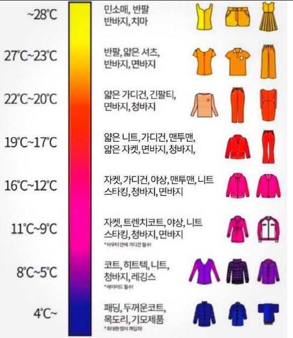 평소 계절 감각이 워낙 없다고 생각했는데, 우연히 2년 전에 본 이 짤 덕분에 매일 매일 출근할때마다 오늘의 기온을 검색하고, 네이버에 기온별 옷차림을 검색한 다음 이미지를 찾아서 그에 맞게 옷을 입은 다음 외출하곤 했다.