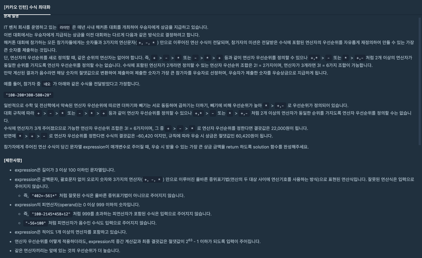 프로그래머스 level 2 수식 최대화 -> programmers.co.kr/learn/courses/30/lessons/67257 코딩테스트 연습 - 수식 최대화 IT 벤처 회사를 운영하고 있는 라이언은 매년 사내 해커톤 대회를 개최하여 우승자에게..