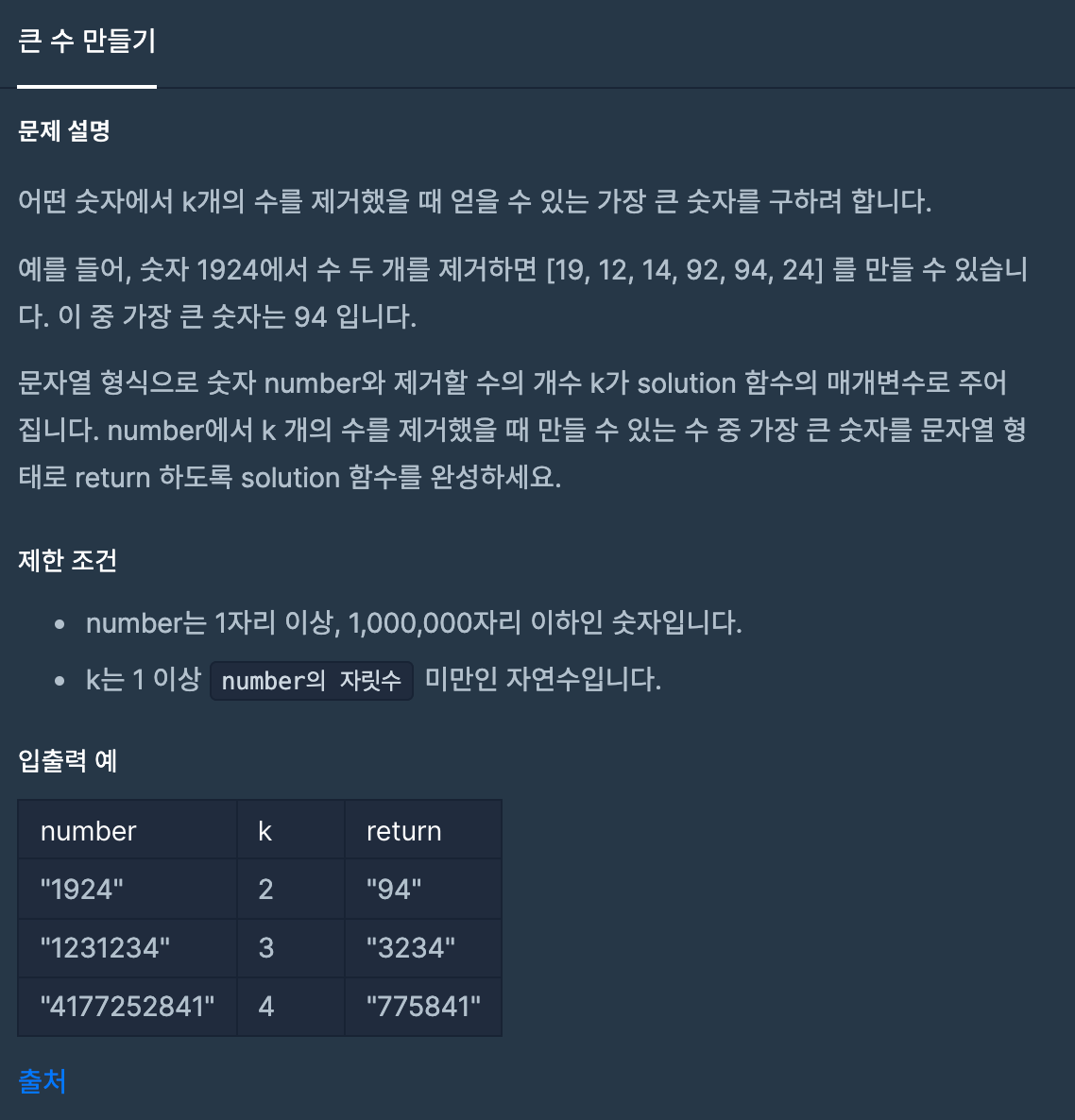 stack 빈배열을 선언하여 값을 계속 추가하고, 마지막 요소를 비교하며 이전 인덱스의 값이 현재 인덱스의 값보다 작다면 그를 제거하고, k의 숫자를 감소시키는 로직으로 코드를 구현했다.