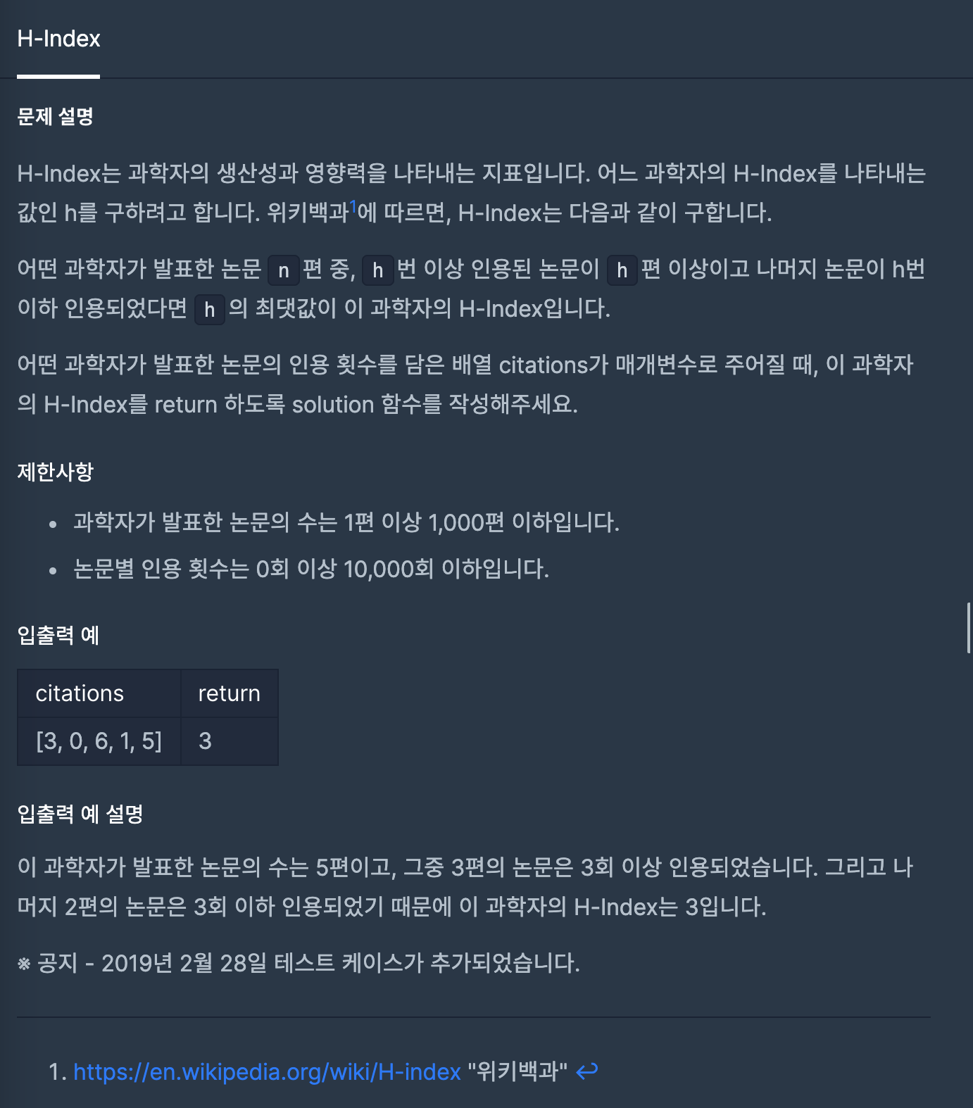 이 문제에서 말하는 h-Index에 대한 정의를 다시 확인해볼 필요가 있다고 느꼈다