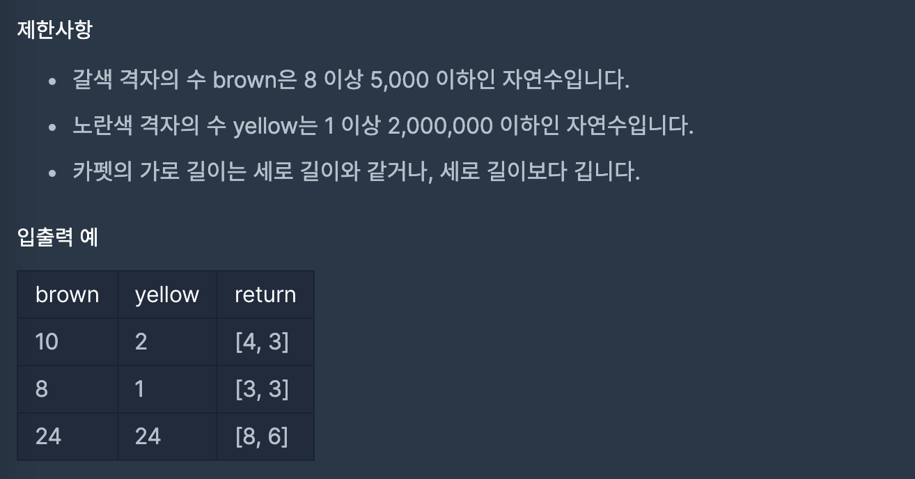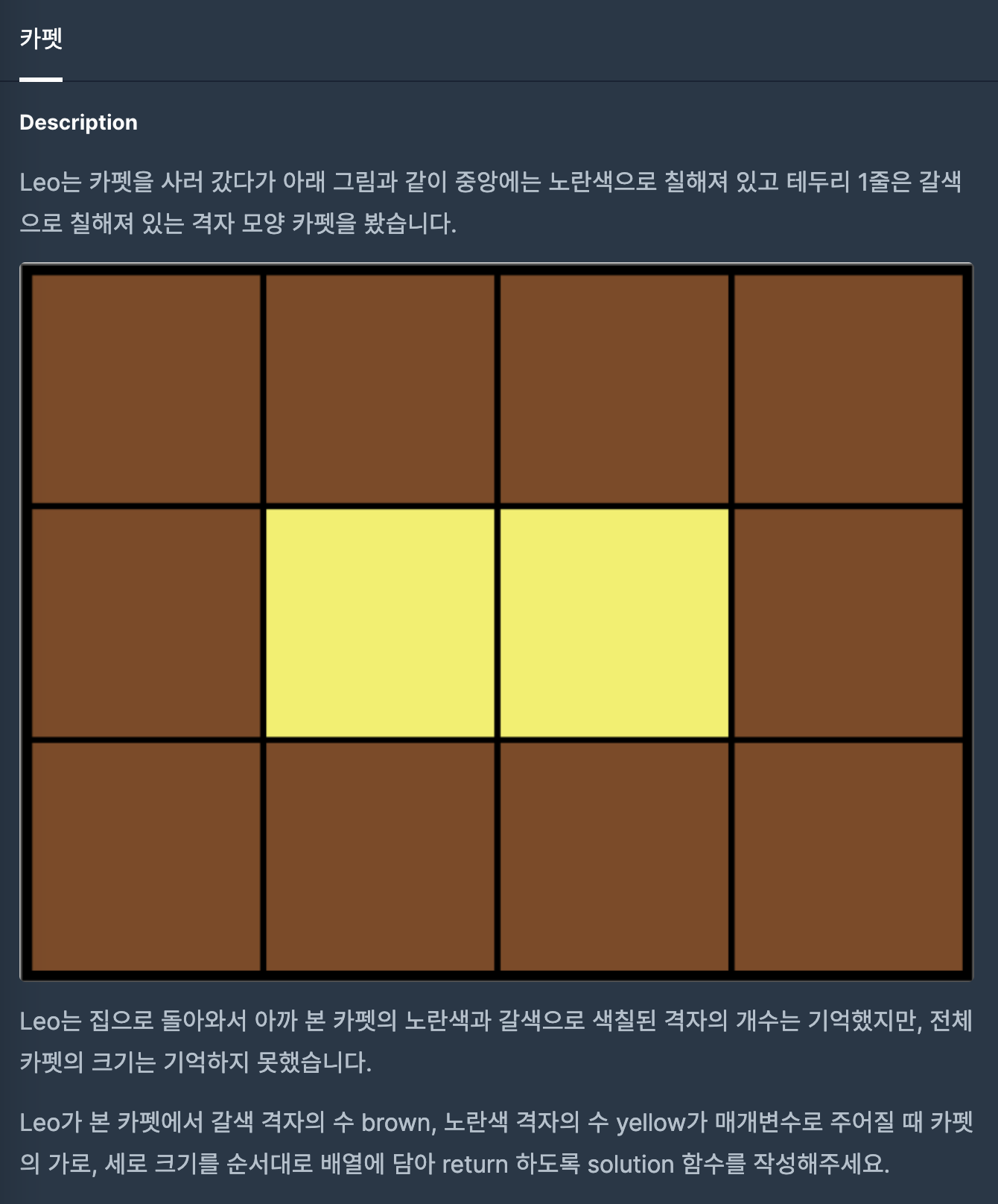 x >= y의 조건을 성립하고, brown은 직사각형이 테두리 한 줄을 차지하며 yellow는 brown을 제외한 공간을 차지한다.