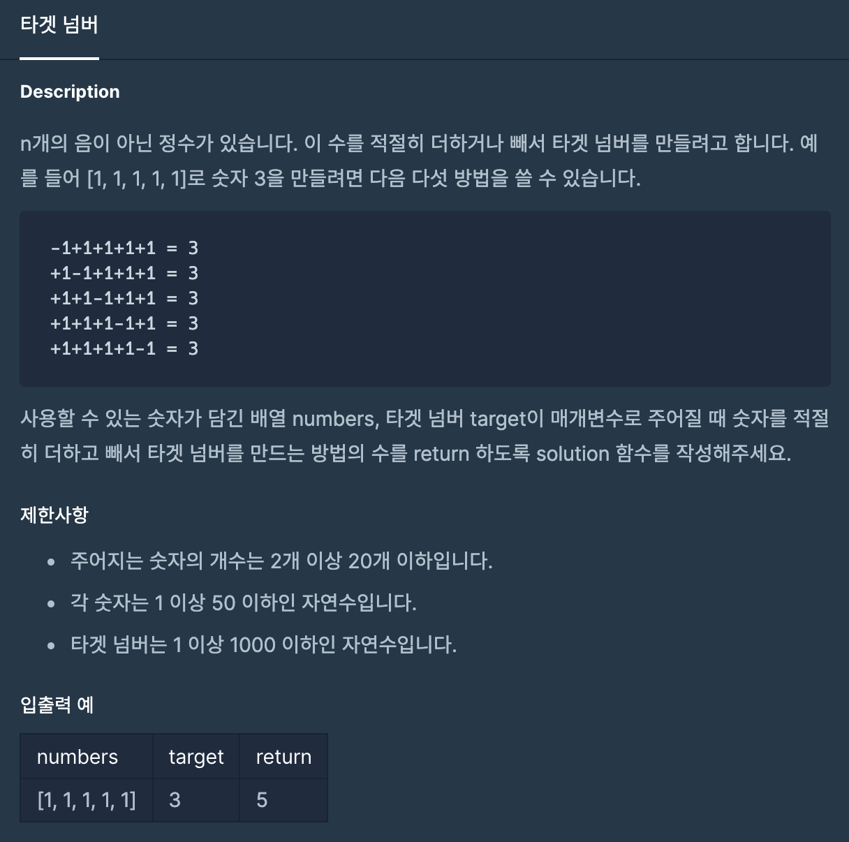 n개의 음이 아닌 정수가 있습니다. 이 수를 적절히 더하거나 빼서 타겟 넘버를 만들려고 합니다. 예를 들어 [1, 1, 1, 1, 1]로 숫자 3을 만들려면 다음 다섯 방법을 쓸 수 있습니다. -1+1+1+1+1 = 3 +1-1+1+1+