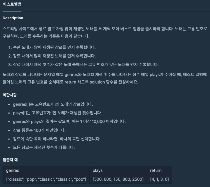 3. 장르 내에서 재생 횟수가 같은 노래 중에서는 인덱스가 낮은 노래를 수록