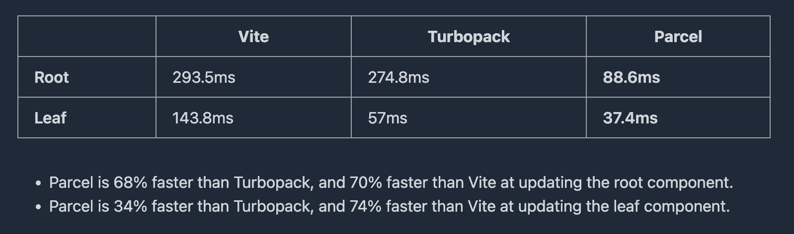 zero configuration의 특징을 갖고 있다 보니 러닝커브 또한 낮으며, Parcel은 멀티 코어 처리를 활용하여 빠른 빌드 시간을 제공하고 파일 시스템 캐시를 사용하여 재빌드 시간을 단축시킬 수 있으며, HMR 기능을 제공한다는 특징이 있습니다.