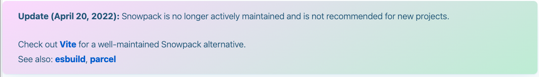스노우팩은 2020 자바스크립트 오픈 소스 어워즈에서 개발 생산 부스터로 1위를 차지했었으나, 현재 사실상 지원 종료를 알리며 Vite을 대안으로 추천하고 있습니다.